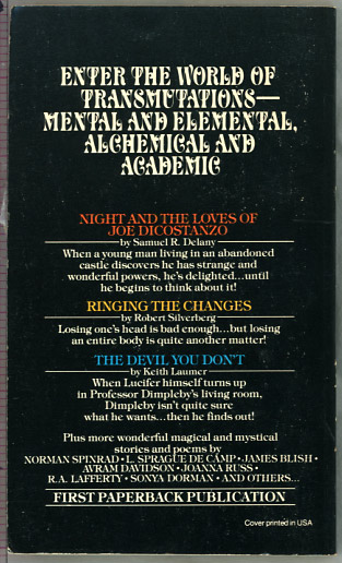 Alchemy & Academe - edited by Anne McCaffrey (1970.) An original anthology - all stories new to the 1970 Doubleday hardcover. I am still amazed at the number and quality of top-flight authors McCaffrey got to contribute stories. Contents: Foreword by Anne McCaffrey "The Dance of the Solids" (Poem) by John Updike (reprint; copyright 1968) "A Mess of Porridge" by Sonya Dorman "The Institute" by Carol Emshwiller "Condilac's Statue" by R. A. Lafferty "The Sorcerers" (Poem) by L. Sprague de Camp "The Weed of Time" by Norman Spinrad "'Night and the Loves of Joe Dicostanzo" by Samuel R. Delany "Come Up and See Me" by Daphne Castell "Shut the Last Door" by Joe Hensley "Big Sam" by Avram Davidson "More Light" by James Blish "The Man Who Could Not See Devils" by Joanna Russ "The Key to Out" by Betsy Curtis "Ringing the Changes" by Robert Silverberg "In a Quart of Water" by David Telfair "Morning-Glory" by Gene Wolfe "Ascension: A Workday Arabesque" (Poem) by Virginia Kidd "The Devil You Don't" by Keith Laumer "The Triumphant Head" by Josephine Saxton "'Mainchance" by Peter Tate