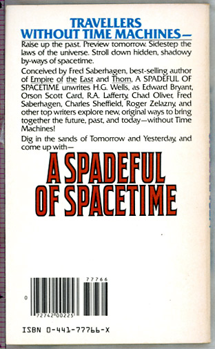 | A Spadeful of Spacetime - edited by Fred Saberhagen. An original anthology - all stories new to this February 1981 edition. Contents: (Introduction by Fred Saberhagen) "Decyphered with the Potshards of Time" - Robert A. Frazier (poem) "Go Starless in the Night" by Roger Zelazny "To Whom It May Concern" by Chad Oliver "St. Amy's Tale" by Orson Scott Card "The Final Days" by David Langford "Recessional" by Fred Saberhagen "Encased in the Amber of Time" - Robert A. Frazier (poem) "The Child Who Cries for the Moon" by Connie Willis "Grain of Truth" by Charles Spano, Jr. "Foreward" by Steve Rasnic Tem "Strata" by Ed Bryant "Forefather Figure" by Charles Sheffield "Experimentum Crucis" by Rivka Jacobs "The Artist in the Small Room Above" by Al Sarrantonio "Bank and Shoal of Time" by R. A. Lafferty "Animated by the Fossils of Time" - Robert A. Frazier (poem)