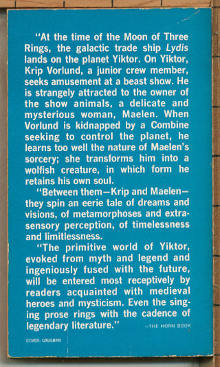 For a good plot summary/set-up and some commentary on Norton, I rely on P. Schuyler Miller, and use excerpts from his review in Analog (June 1967): "But Moon of Three Rings is not only the story of why it is that Krip Vorlund has taken refuge in the body of an animal, or how he is going to find his kidnapped body and return to it. Even for an Andre Norton story, there are almost as many interwoven plots as in one of A. E. Van Vogt's most intricate tangles. The difference is that they make sense. One of the feudal princelings of Yiktor has a very practical reason for wanting to capture a Free Trader and pry out of him information that will give him the same advantages and powers the off-worlders enjoy. Maelen, one of an ancient race who were the hill-folk of Yiktor long before Earthmen found it has a mission of her own. Her people, the remaining Thassa, have their traditions and their motives. This is one of the stories which Andre Norton embroiders the theme of symbiosis between men and animals in the far future. The Thassa can link themselves telepathically with the intelligent animals who take part in their tent shows and in whose bodies they live and run in exchange. Like T. H. White's Merlin… the Thassa know that to be an animal is a vital educational tool." [P. Schuyler Miller] | |||