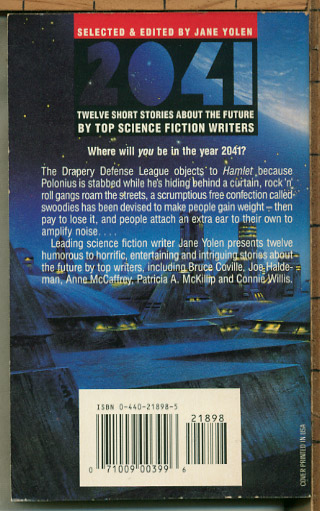 2041, a (mostly) original anthology edited by Jane Yolen. The Willis and Kerr stories are reprinted or revised from original appearances in 1987; the rest are original to the 1991 hardcover of this book. (Introduction by Jane Yolen) | |||