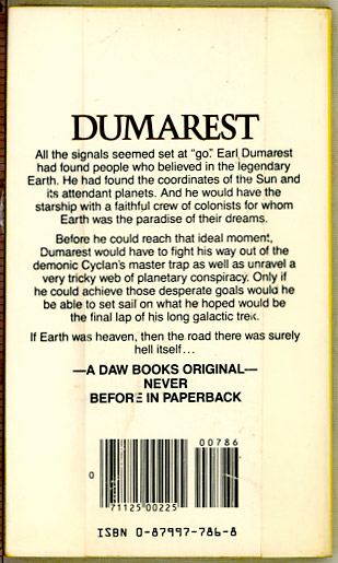 The Dumarest series lasted about 30 books, and I would recommend most of the early ones (particularly the Ace-Doubles) as good reading. If you're not familiar with the premise, Earl Dumarest was born on Earth, but wandered so far from it in a crowded galaxy that people in the region he is currently in think that Earth is but a legend, like "El Dorado." (The Traveller gaming system, with High and Low Passage, quicktime and basic, is loosely based on the very populated galaxy Dumarest travels in.) He picks up friends and enemies, and occaisionally a clue pointing towards Earth. Earth is Heaven - #27 in the series. All the signals seemed set at "go." Earl Dumarest had found people who believed in the legendary Earth. He had found the coordinates of the Sun and its attendant planets. And he would have a starship with a faithful crew for whom Earth was the paradise of their dreams. Before he could reach that ideal moment, Dumarest would have to fight his way out of the Cyclan's master trap as well as unravel a very tricky web of planetary conspiracy. Only if he could achieve those desperate goals would he be able to set off on what he hoped would be the final lap of his lifelong galactic trek. If Earth was Heaven, then the road there was surely hell itself... | |||