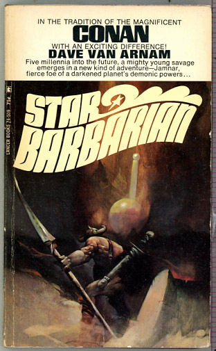 | Star Barbarian (1969) a novel by Dave Van Arnam. [the back cover copy]: "A towering new hero and an epic adventure... in a darkened world of the future: Centuries before, the multiwave-drive ships had come to Morkath of the Caravan Stars - bringing colonists, empires, confederations of plunderers. Finally, the planet was exhausted and left to descend slowly into barbarism... Now, savage tribal leaders fought over the blighted lands. Among those warriors was the young hunter Jamnar, who vowed to reclaim Morkath from the demonic powers that gripped it - the dark god Shaphath, the priestesses of Astaphar, the evil priests called the Jvunuvun... The might Jamnar would have aid in his quest. Prosperon, the interstellar castaway, would lead himto the Forbidden Temple of Telshashoth. But only Jamnar himself dared to enter the temple's portals - and therein to seize the 3000-year-old secret of a lost civilization - could he hope to save a people and a planet plunged into infamy and terror?" [This has a sequel: Lord of Blood (1970.)]