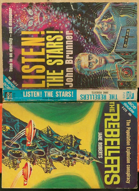 | Ace Double F-215 (1963): containing Listen! The Stars! by John Brunner, bound with The Rebellers by Jane Roberts. Listen! The Stars! by John Brunner (96 pages; cover by Ed Emshwiller.) There was a shorter (?) version in Analog July 1962, and this was later slightly expanded as The Stardroppers. (Bound with) The Rebellers by Jane Roberts (cover by Jack Gaughan, 155 pages.) In the 20th Century, a typical quiet, small American city - in the 23rd Century a teeming wildly overpopulated "contropolis" where millions of starved, half-crazed people swarmed through the streets in purposeless search for food, for rest, or for death. Above the mad, carnival-like scene the loudspeakers blared out their command to work, until night brings quiet and the "street-cleaners" came to shovel up the bodies of the dying. Into this nightmarish world of the future came Gary Fitch, a man who had not seen the outside world for 15 years. He found himself faced with the almost impossible task of bringing order to a completely chaotic world, of restoring some remnant of civilization to a breed that had turned into animals. And in saving mankind, he had also to face a new scourge - the return of plague. |
