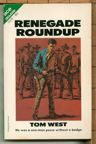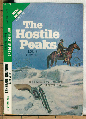 An Ace Double from 1969, containing The Hostile Peaks by Louis Trimble, bound with Renegade Roundup, by Tom West. There are at least 2 other Ace-Double Westerns featuring this pair of authors. The Hostile Peaks by Louis Trimble - (cover by ???, and frontispiece by ??; 127 pages.) Someone had stolen a shipment of Army guns and ammunition, and with the locak Indians being stirred up, this could mean trouble for the isolated settlers of that mountainous territory. Clint Larabee had been sent to find the missing guns, but by the time he was sure he knew where they were, there didn't seem to be much he was likely to be able to do about it. For one thing there were already 2 hardcases following right behind him on his trail, and for another there was the pack of desperate gun-runners up ahead. On all sides, nothing but rocks, mountains, snow - no way up, no way down, no way across. For Clint it sure looked like the end of the trail. He could stand his ground and freeze to death. Or he could move and take his chances on hot-lead poisoning. The choice was his - and there was no time to waste. I used to think Trimble split his output between SF and Westerns, but a little research reveals he has been writing since the mid-Forties with 4 dozen books: about half are mysteries, a dozen or more westerns, and only 6 SF books from 1968-74.