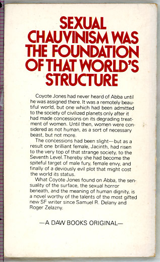The planet Abba had only been admitted to the society of civilized planets after it had made concessions on its degrading treatment of women, who had previously been considered necessary beasts, not even human. As a result of these concessions, one brilliant woman, Jacinth, had risen to the very top of that strange society, to the Seventh Level. Now Abba needs Jacinth's skills, but there is a murder plot against her. Coyote Jones is called in to intercede, and naturally, gets involved. As a prolog, this includes "For the Sake of Grace" from Magazine of F&SF (1969.) | |||
