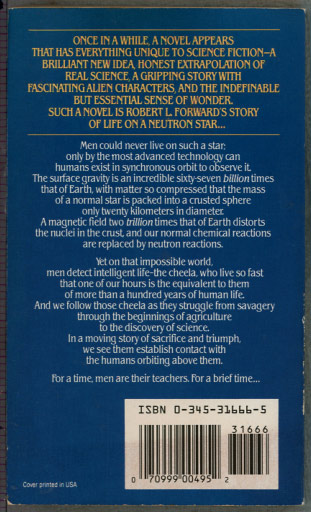 Dragon's Egg - Robert L. Forward's first novel. Life on a Neutron Star: the surface gravity is an incredible 67 billion times that of Earth, with matter so compresed that the mass of a normal star is packed into a crusted sphere only 20 kilometers in diameter. A magnetic field 2 trillion times that of Earth distorts the nuclei in the crust, and our normal chemical reactions are replaced by neutron reactions. Men could never live on such a star; only by the most advanced technology can humans exist in synchronous orbit to observe it. Yet on that impossible world, men detect intelligent life - the Cheela, who live so fast that one of our hours is the equivalent to them of more than 100 years of human life. | |||