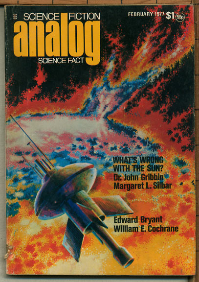 Analog Science Fiction - Science Fact February 1977 (Vol 97, No.2) Science Fact: "Is Something Wrong with the Sun?" by Margaret L. Silbar Stories: "Particle Theory" by Edward Bryant (a Nebula Award finalist) "Portions of This Program" by Dean Ing. Feature: "Political Science" by Jeff Rovin. Ben Bova’s editorial is "Good News, Bad News." Book reviews by Lester del Rey. |