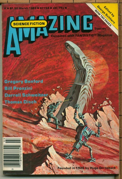 Amazing Science Fiction: March 1983 (Volume 56, Number 5) [note that the Volume & Number have been corrected to match the system in place through August 1979.] Illustrations by Alex Schomburg, Jack Gaughan, Karl Kofoed, Stephen Fabian, Frank Borth, George Barr. Cover by Jack Gaughan (for "Against Infinity.") Fiction: "Epitaph" by Bill Pronzini "I Lost My Love to the Space Shuttle Columbia" by Damien Broderick "Favor" by J. Michael Matuszewicz "The Desert of Vast Eternity" + "There is an Index By First Lines" (verse) by Tom Disch "Continued Lunacy" by Darrell Schweitzer "In the Islands" by Pat Murphy "The Syncopated Man" by Sharon Webb "Sand Painting" by Allen L. Wold "On the Rebound" by Jack C. Haldeman II Serial: "Against Infinity" (Part 1) by Gregory Benford. Nonfiction/Essays: "An Interview with A. Bertram Chandler" conducted by Darrell Schweitzer "Improbable Bestiary: The Troll" (verse) by F. Gwynplaine MacIntyre "The Amazing Years" by Cele Goldsmith Lalli. |