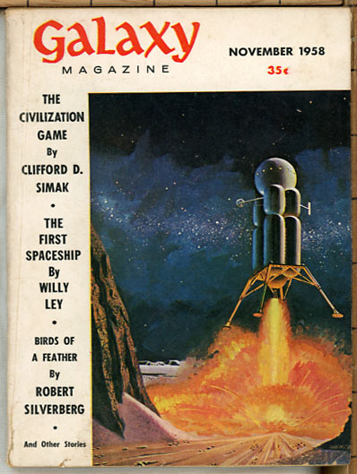 GALAXY Science Fiction: November 1958 (Volume 17, Number 1) Novelets: "The Civilization Game" by Clifford D. Simak Stories: "People Soup" by Alan Arkin Serial: "Time Killer" (Part 2 of 4) by Robert Sheckley (book title was Immortality, Inc.) Science: "For Your Information: The First Spaceship" by Willy Ley H. L. Gold's editorial is "The Tin Age." Book reviews by Floyd C. Gale. |