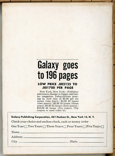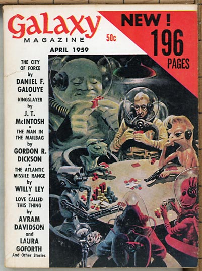 GALAXY Science Fiction: April 1959 (Volume 17, Number 4) Novella: "The City of Force" by Daniel F. Galouye Novelets: "Kingslayer" by J. T. McIntosh Stories: "Security Plan" by Joseph Farrell Science: "For Your Information: The Atlantic Missile Range" by Willy Ley H. L. Gold's editorial is "So Far." Book reviews by Floyd C. Gale. |