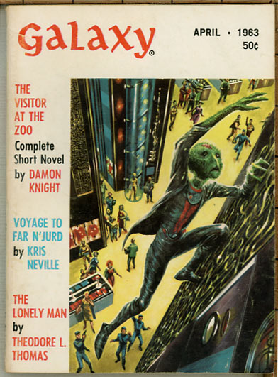 Galaxy Science Fiction: April 1963 Volume 21, Number 4 Short Novel: "The Visitor at the Zoo" by Damon Knight [expanded book version titled Mindswitch (1965); a.k.a. The Other Foot.] Novella: "Voyage to Far N'Jurd" by Kris Neville. Novelette: "The Lonely Man" by Theodore L. Thomas. Stories: "My Lady Selene" by Magnus Ludens Science: "For Your Information: Too Much Imagination" by Willy Ley Frederik Pohl's editorial is "Dramatis Personae." Book Reviews by Floyd C. Gale. |