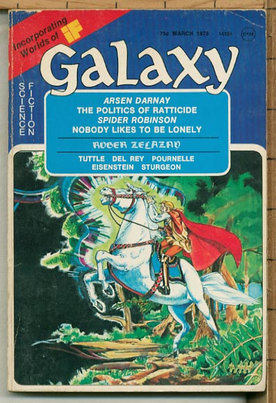 GALAXY Science Fiction: March 1975 (Volume 36, Number 3) Novelettes: "The Politics of Ratticide" by Arsen Darnay Stories: "In This Month's Issue" by Steve Carper Serial: "Sign of the Unicorn" (Part 3 of 3) by Roger Zelazny. Science: "A Step Farther Out: ABM, Missile-Eating Lasers and a Bi-Polar World" by Jerry Pournelle, Ph.D. Forum: "The Siren Song of Academe" by Lester del Rey. Jim Baen is editor. Book reviews by Theodore Sturgeon. |