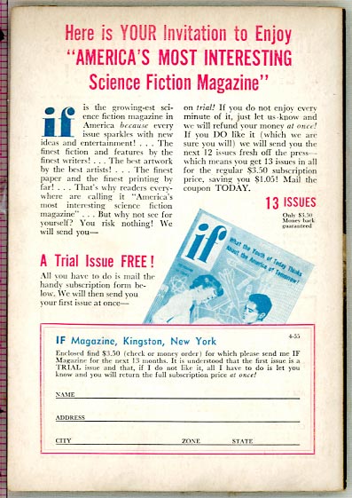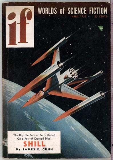 IF - Worlds of Science Fiction: April 1955 (Volume 5, Number 2) Short Novel: "Shill" by James E. Gunn Novelette: "Task Mission" by Fox B. Holden Stories: "One Love Have I" by Robert F. Young Edited and published by James L. Quinn (who edited from November 1952 to August 1958.) Asssitant editors are Eve Wulff, Robert W. Greene; Art Editor is Ed Valigursky. IF is now monthly for a year or so (then back to bimonthly in June 1955 - on the even months.) |