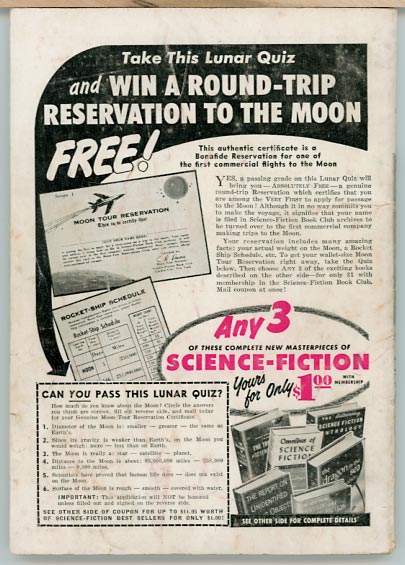 Tight and square, spine is flat with light wear (some faint crossing lines at middle & bottom.) Moderate overall wear including bump-trace (2" or less) at lower left corner of front cover; heavier wear to back cover including 3" crease at middle left of back cover. Age-tanning is a little less than average for its vintage. No stamps, marks or writing. |