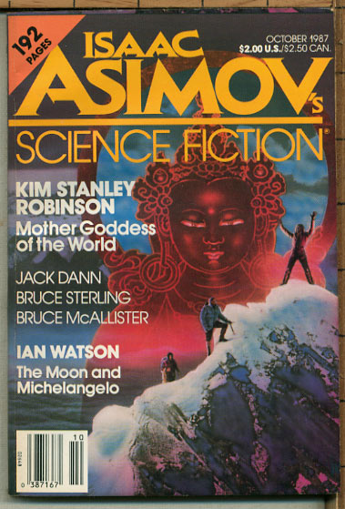 Isaac Asimov's Science Fiction Magazine October 1987 Novella: "Mother Goddess of the World" by Kim Stanley Robinson (Hugo nominee / a sequel to "Escape from Kathmandu.") Novelettes: "Dream Baby" by Bruce McAllister [Hugo & Nebula nominee] Stories: "The Little Magic Shop" by Bruce Sterling Regular Features include an editorial by Isaac Asimov, Gaming column by Matthew J. Costello, a letter column, "The SF Conventional Calendar" by Erwin S. Strauss, Norman Spinrad: "On Books. |