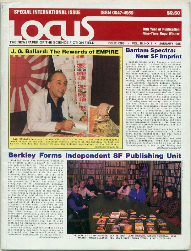 Features seen every month include Richard Curtis’ column “Agent’s Corner,” LOCUS monthly bestseller list, “LOCUS Looks at Books” (book reviews by Faren Miller, Debbie Notkin - both every issue), column “Moons & Stars & Stuff” by Fritz Leiber; “People and Publishing (now almost a full page per issue),” and some issues have a letter column. Norman Spinrad’s column “Staying Alive” is only in February & April. Issue #288: January 1985: J. G. Ballard: The Rewards of EMPIRE; Bantam Spectra: New SF Imprint; Berkley Forms Independent SF Publishing Unit; Going to the Devil with D&D?; Alan Lee: Castles in America; Waldenbooks starts discount chain; A Wake for Timescape; Along Publishers Row (forthcoming books); Japanese Book Reviews, by Y. Kobayashi, S. Maki, E. Lipsett; “French before English” by Pascal J. Thomas; The Micro-World of Danish SF, by Ellen M. Pederson; Report from France; 11th French SF Convention; SF in Japan; 1984 World Fantasy Convention (lots of photos); convention listings; November magazines; November Books; 1984 Locus index. |